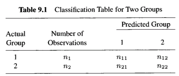 \text{Apparent Error Rate} &= \frac{\text{Total Misclassifications}}{\text{Total Observations}}\\ &= \frac{n_{12} + n_{21}}{n_{1} + n_{2}}\\ &= \frac{n_{12} + n_{21}}{n_{11} + n_{12} + n_{21} + n_{22}}\\ \end{align}$$