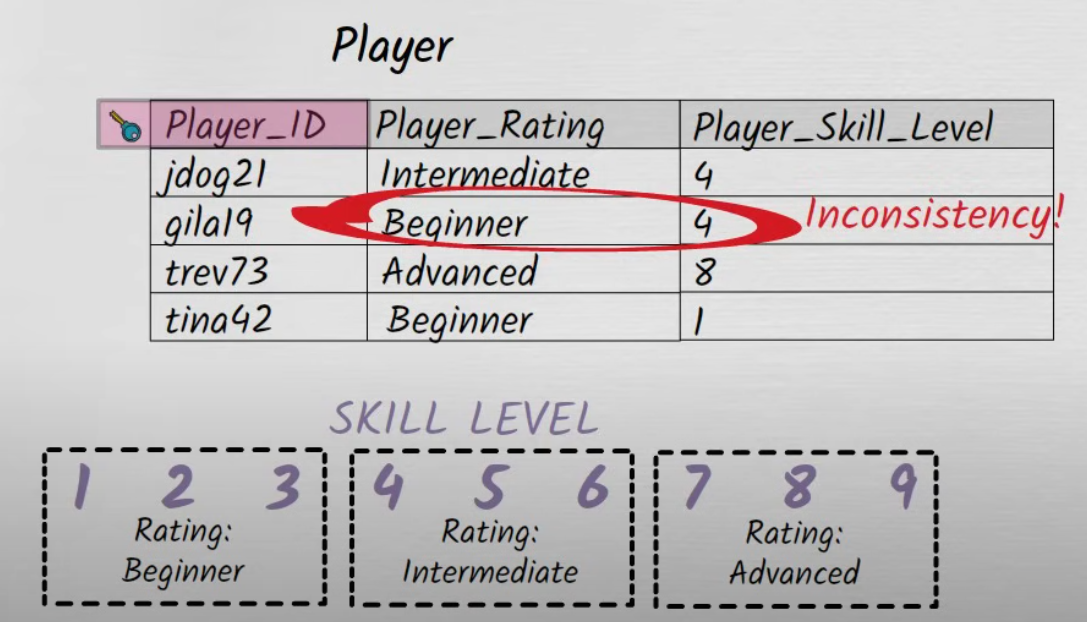 Update anomaly occurs when is updated, yet for some reason is not updated, causing inconsistensy.