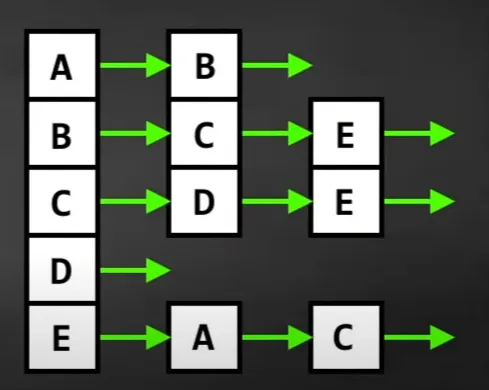 Represent graph with a collection of linked lists, where the first element in each list correspond to a vertex in the graph, and the following elements correspond to the neighboring vertex.