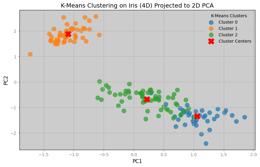 plt.title("K-Means Clustering on Iris (4D) Projected to 2D PCA", fontsize=14, color='black')