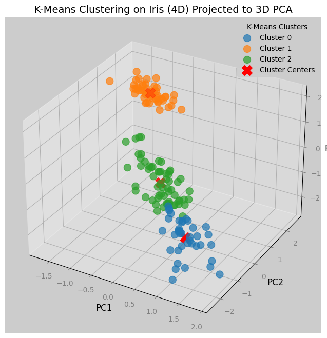ax.set_title("K-Means Clustering on Iris (4D) Projected to 3D PCA", fontsize=14, color='black')